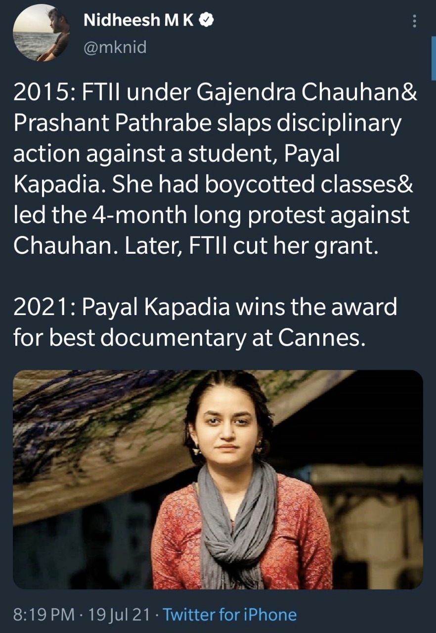 Cannes 2021: Filmmaker Payal Kapadia Wins Best Documentary for Her Film ‘A Night of Knowing Nothing’ . The Mumbai-based filmmaker’s documentary bagged the award in a category where 28 documentaries were presented across various festival sections.